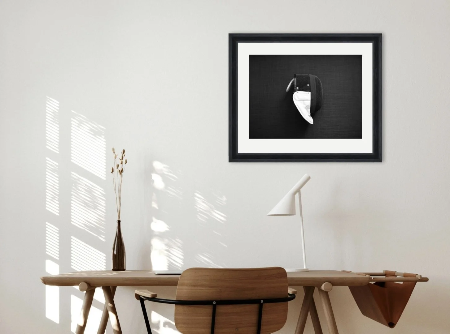 This black and white profile portrait of an épée mask balances precision and stillness. The steel grid, fabric trim, and layered padding are rendered with clarity and restraint, turning a piece of sports gear into modern visual poetry. Or maybe something less pretentious.